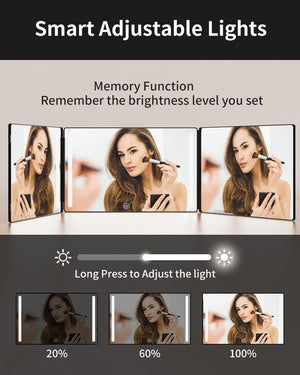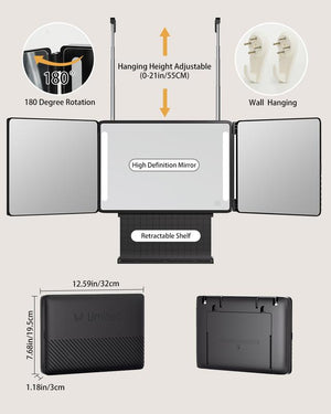 Umitec-ის 360°-იანი სამმაგი სარკე რეგულირებადი LED განათებით თვითშეჭრისა და მოვლისთვის
